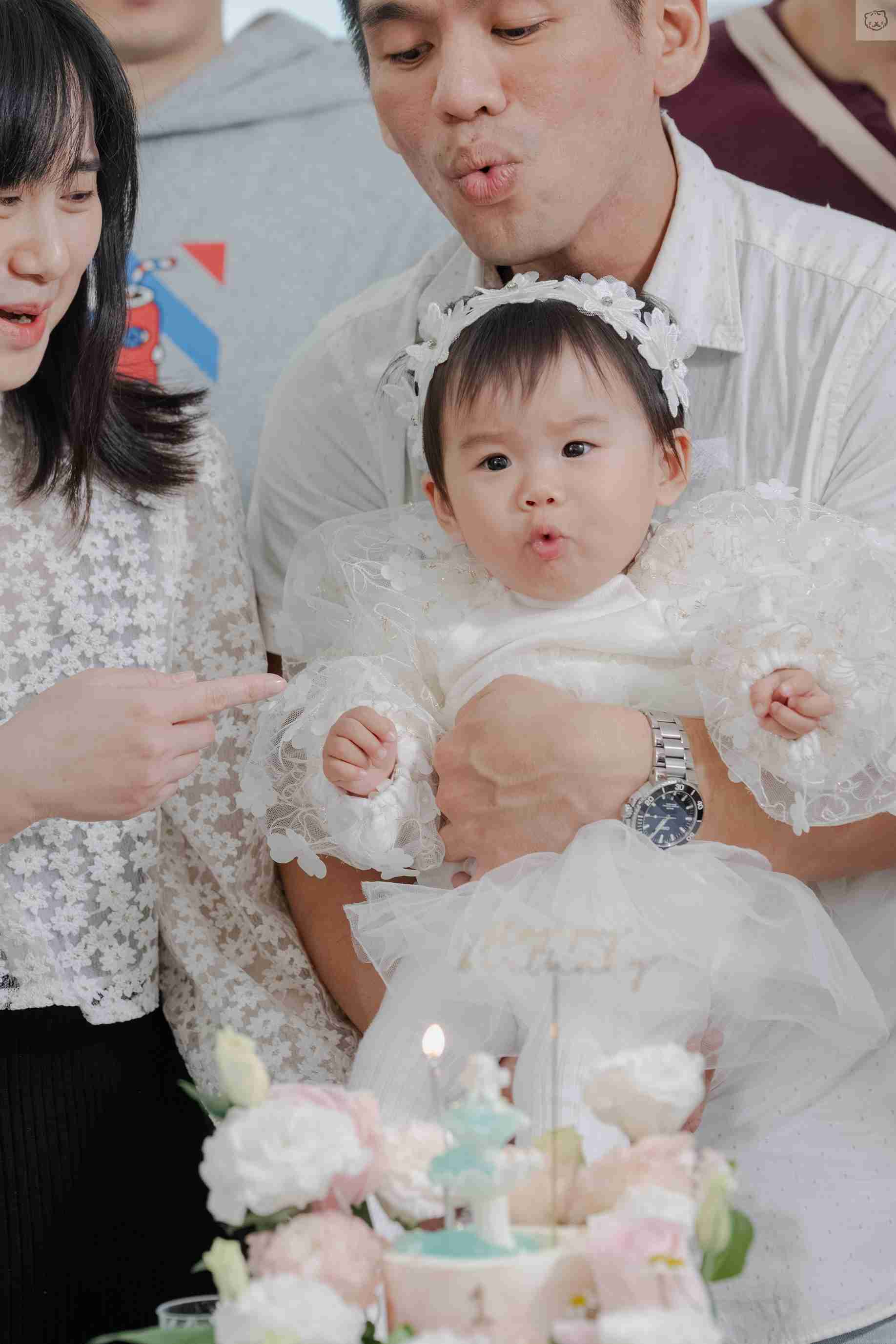 美麗的媽媽準備超美的噴泉蛋糕,當主持人cue大家一起吹蠟燭,驚見寶寶眉頭微微皺起,竟也小嘴一嘟,奮力對蠟燭猛吹,萌度爆表,讓在場所有人笑翻!