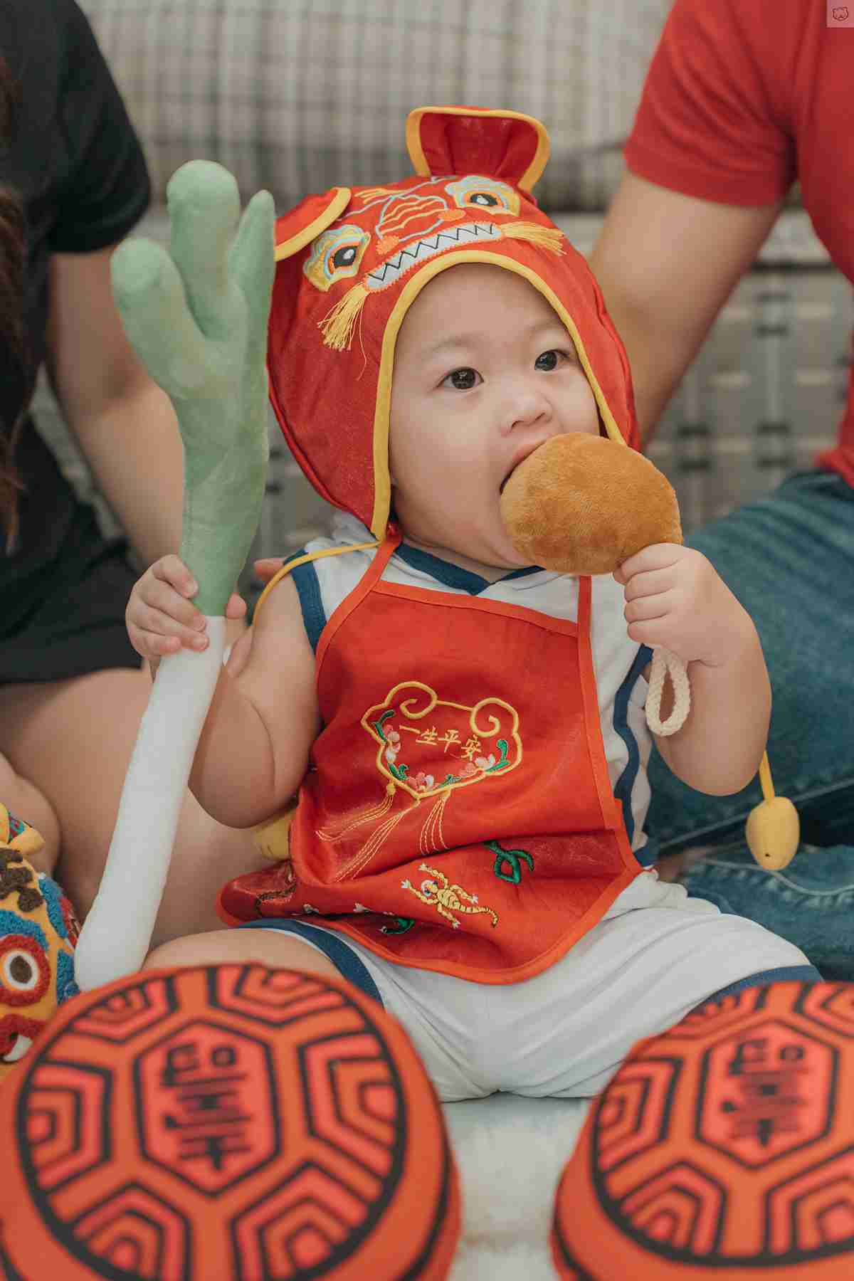在還無法控制膀胱的年紀,聰明的饅頭寶寶已經可以自己拿雞腿、自己敲鑼乾脆又俐落,各種儀式都難不倒他!