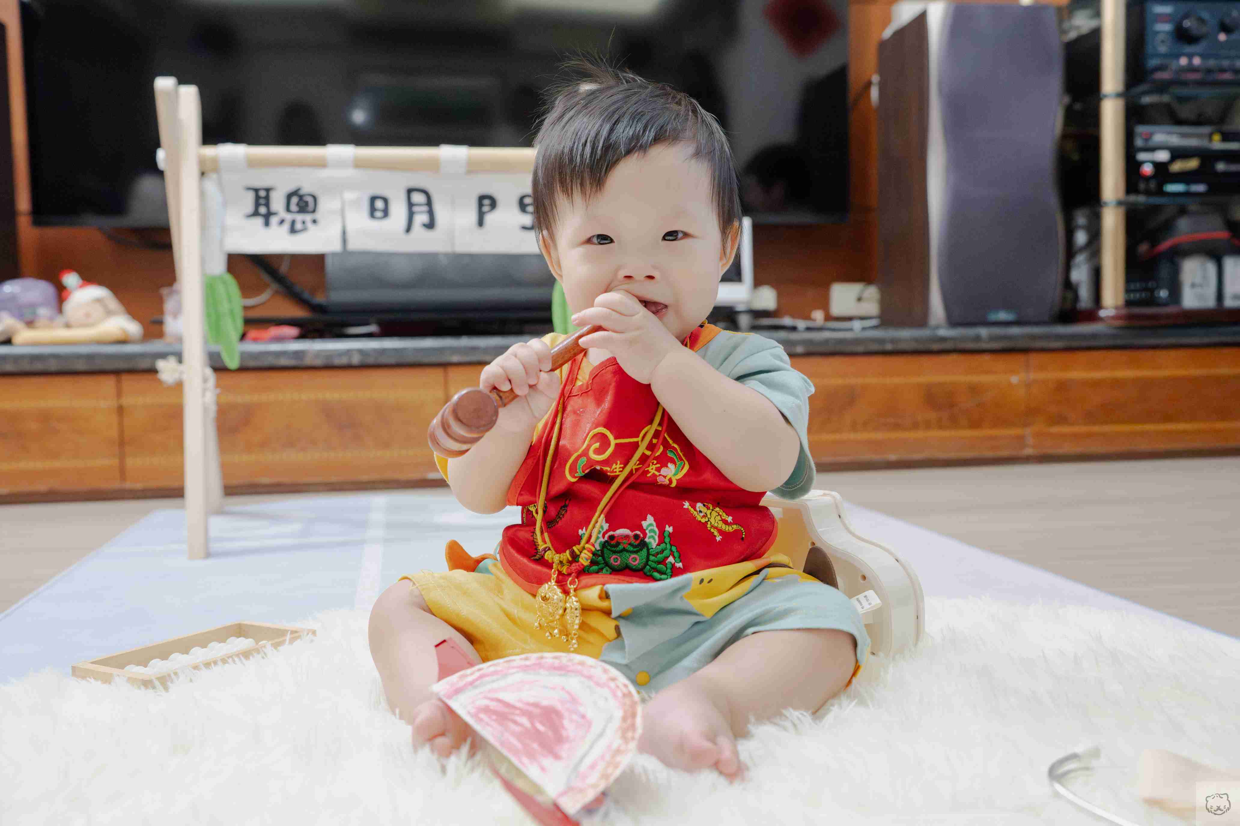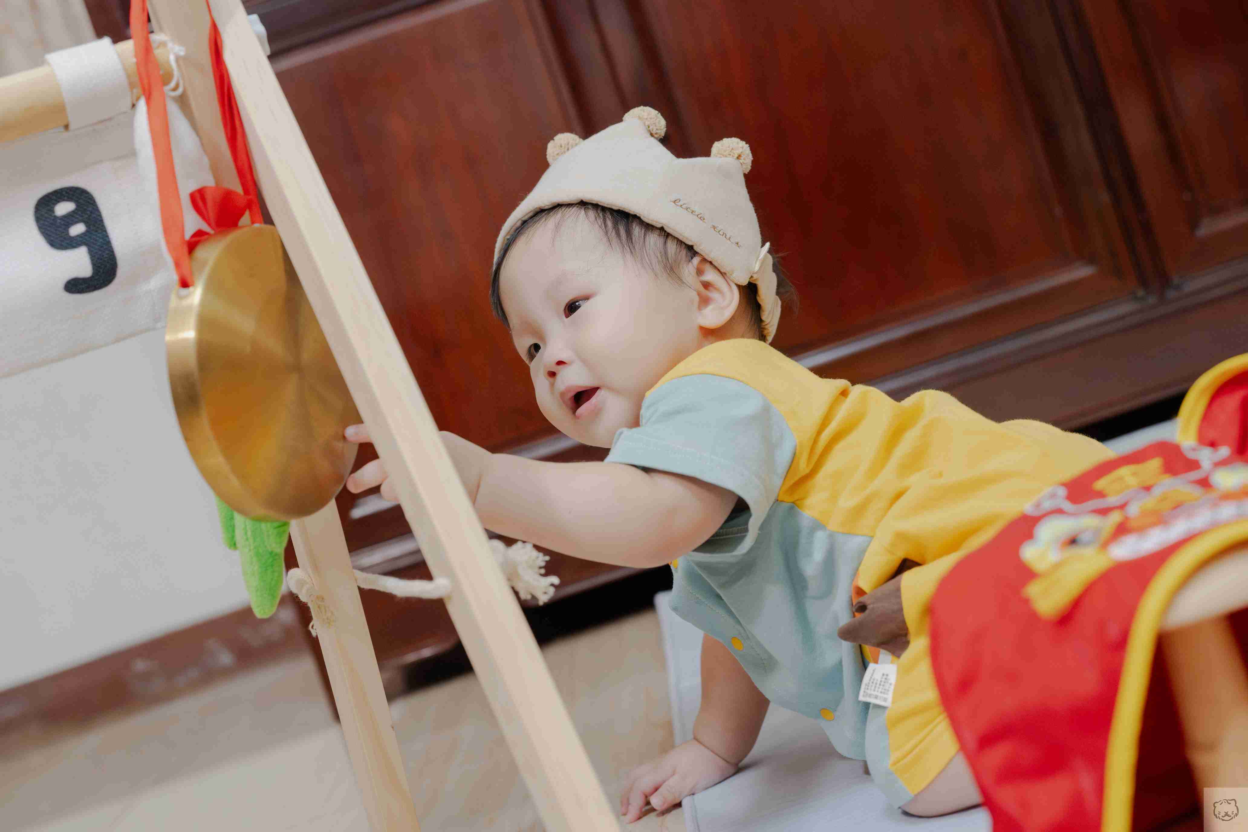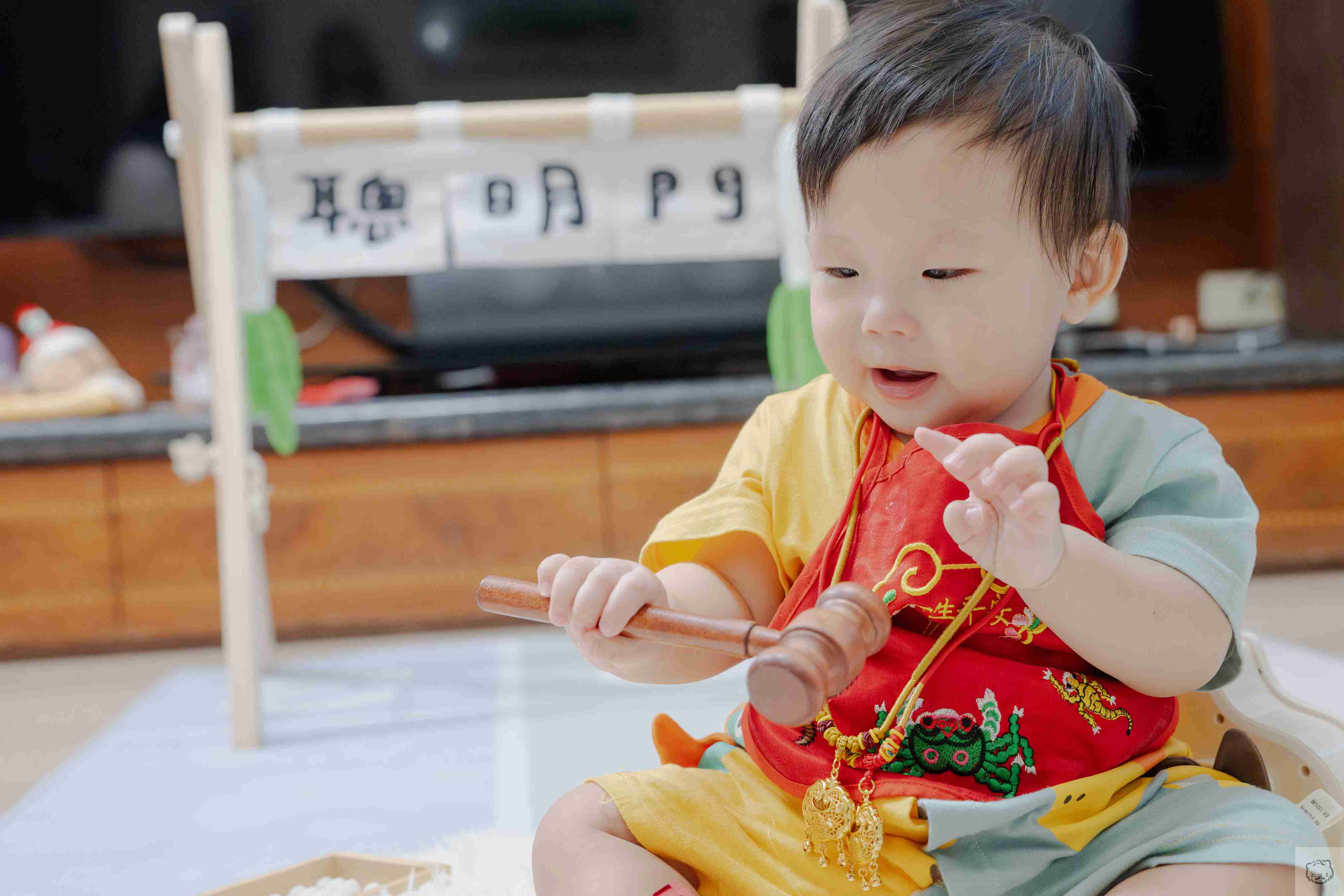 抓周還沒開始,寶貝往聰明門邊上的鑼靠近,小手沒有猶豫,輕輕一敲,聲音清亮而篤定