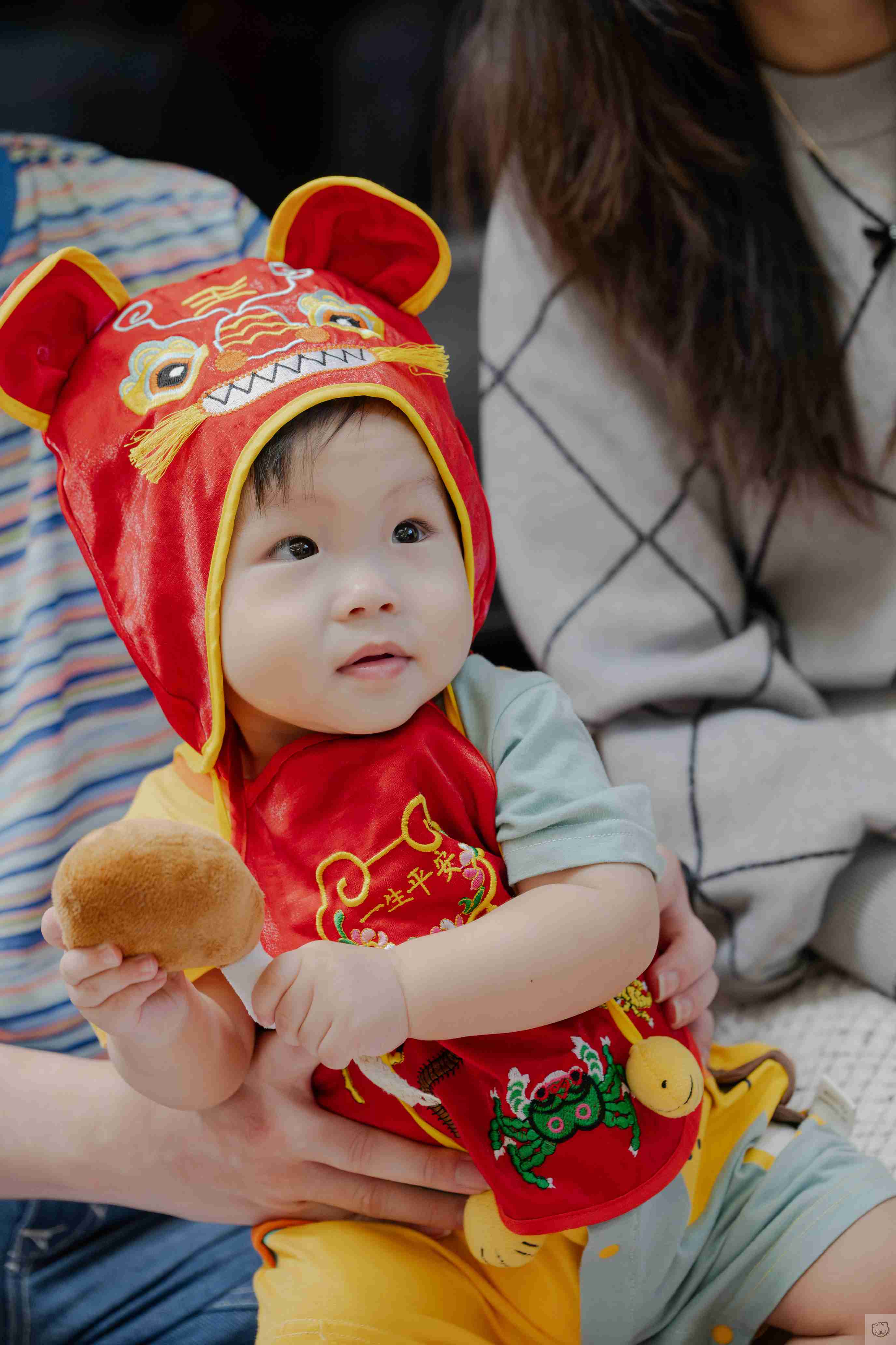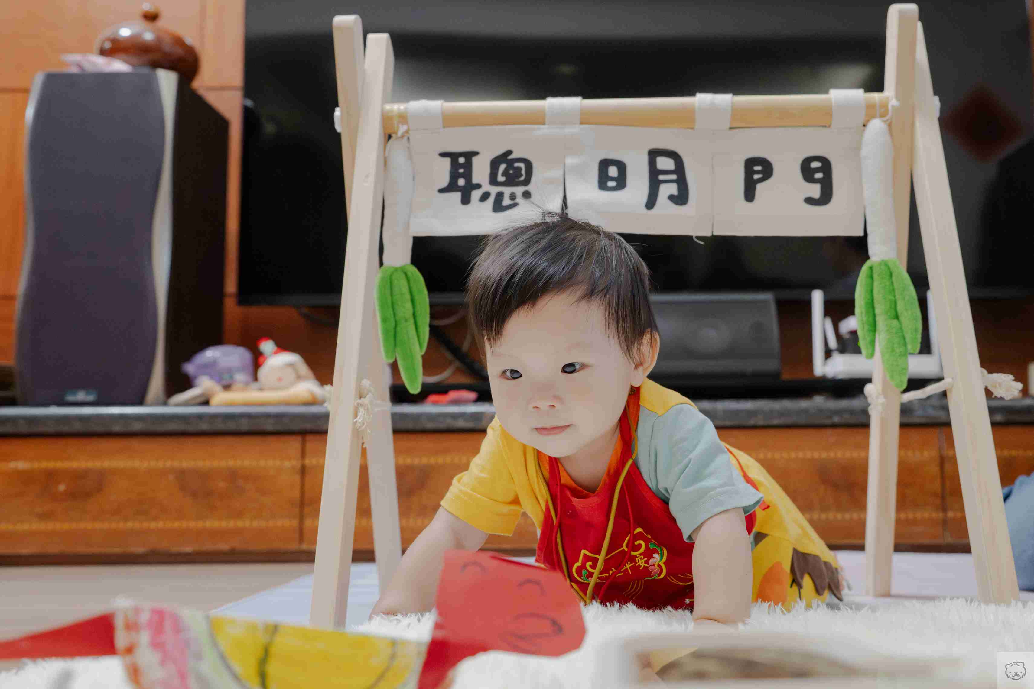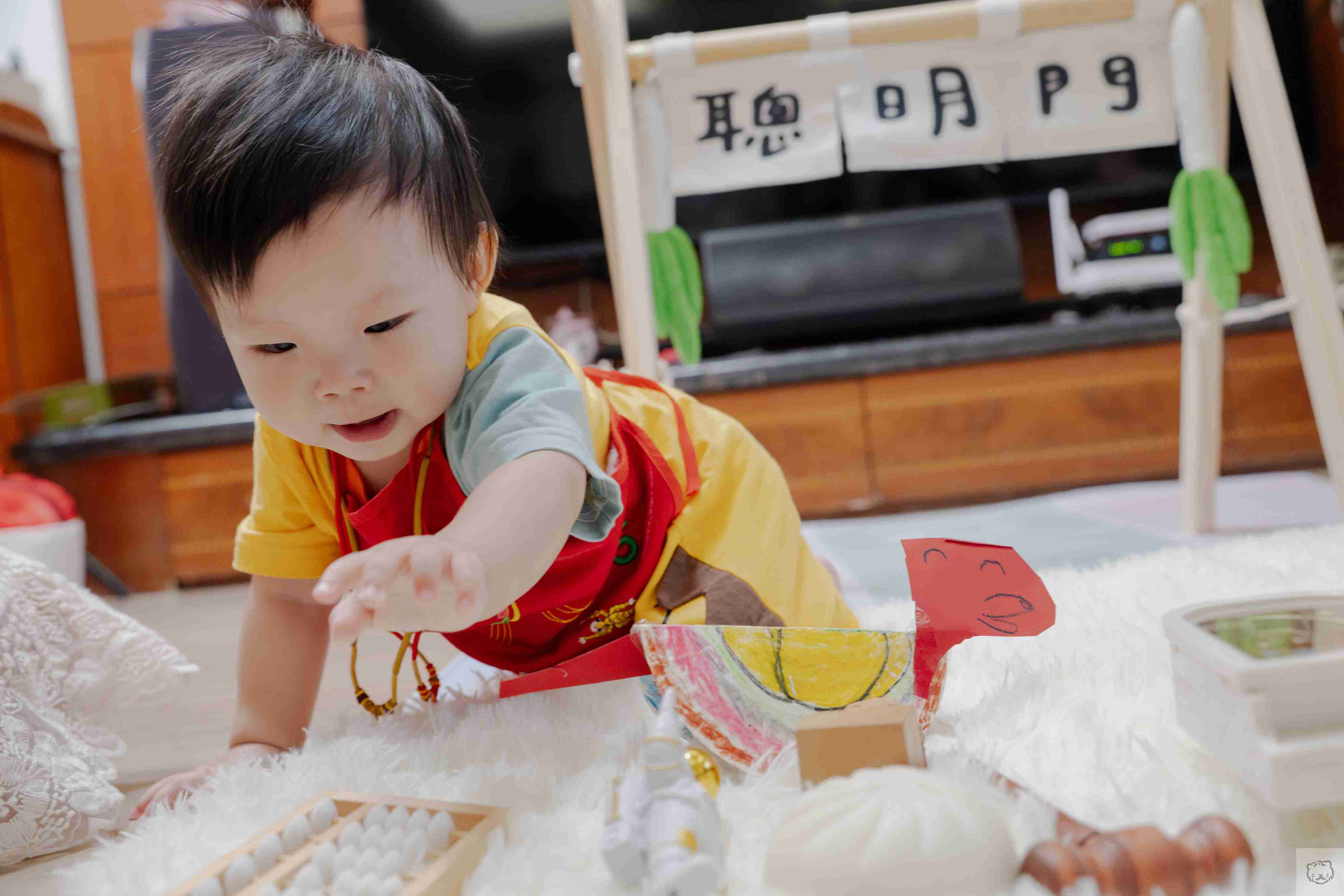 抓周還沒開始,寶貝往聰明門邊上的鑼靠近,小手沒有猶豫,輕輕一敲,聲音清亮而篤定